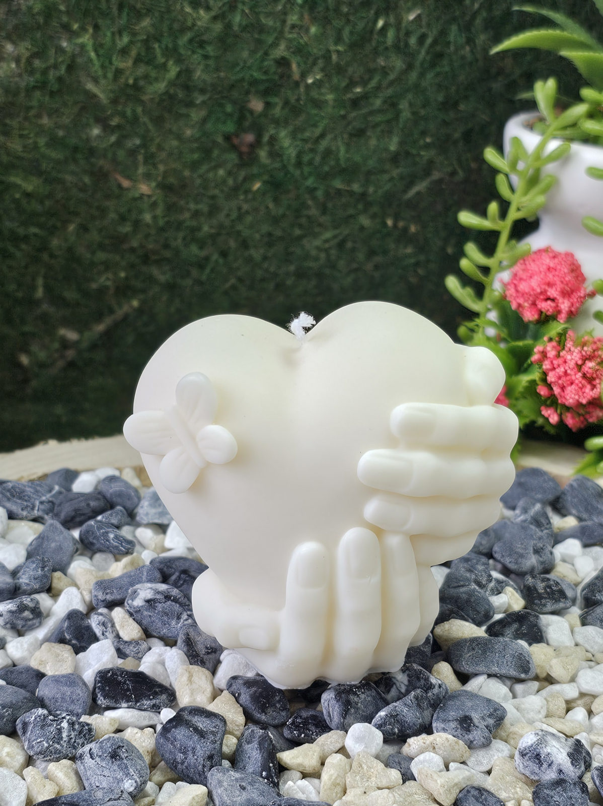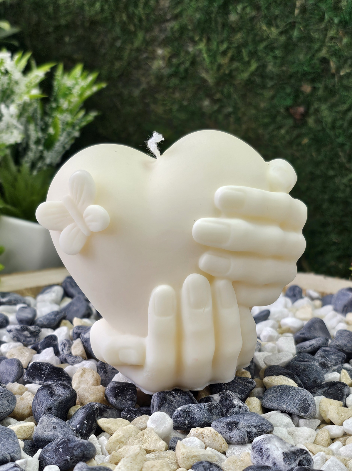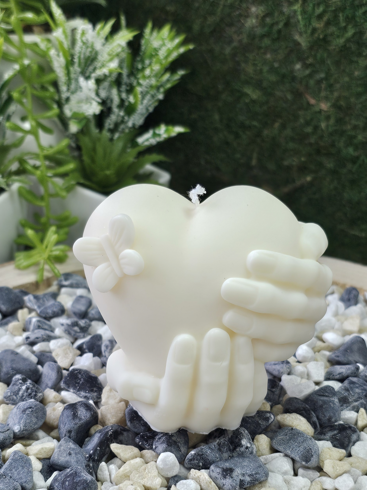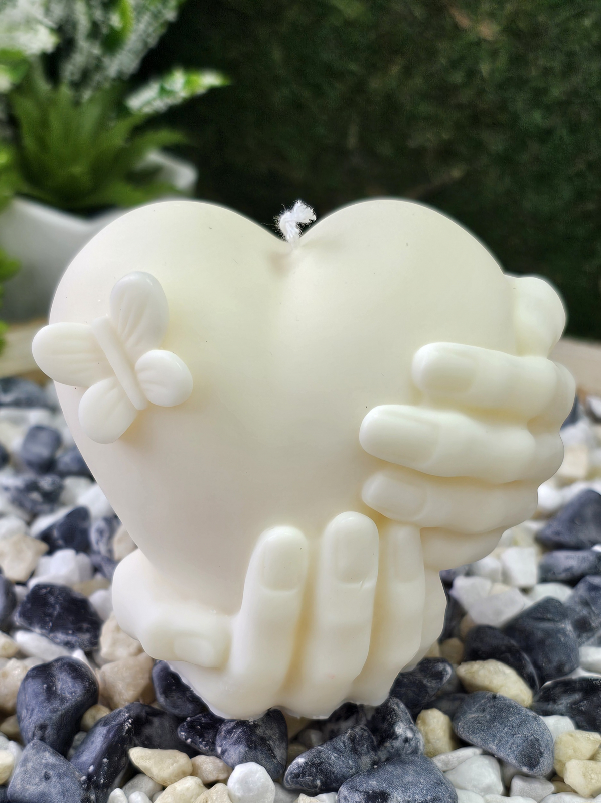 Realizată sub forma unei inimi purtate cu grijă de două mâini și împodobită cu un fluture grațios, această lumânare simbolizează iubirea protejată și transformarea unui nou început. Este o alegere unică și plină de emoție pentru mărturia voastră de nuntă.