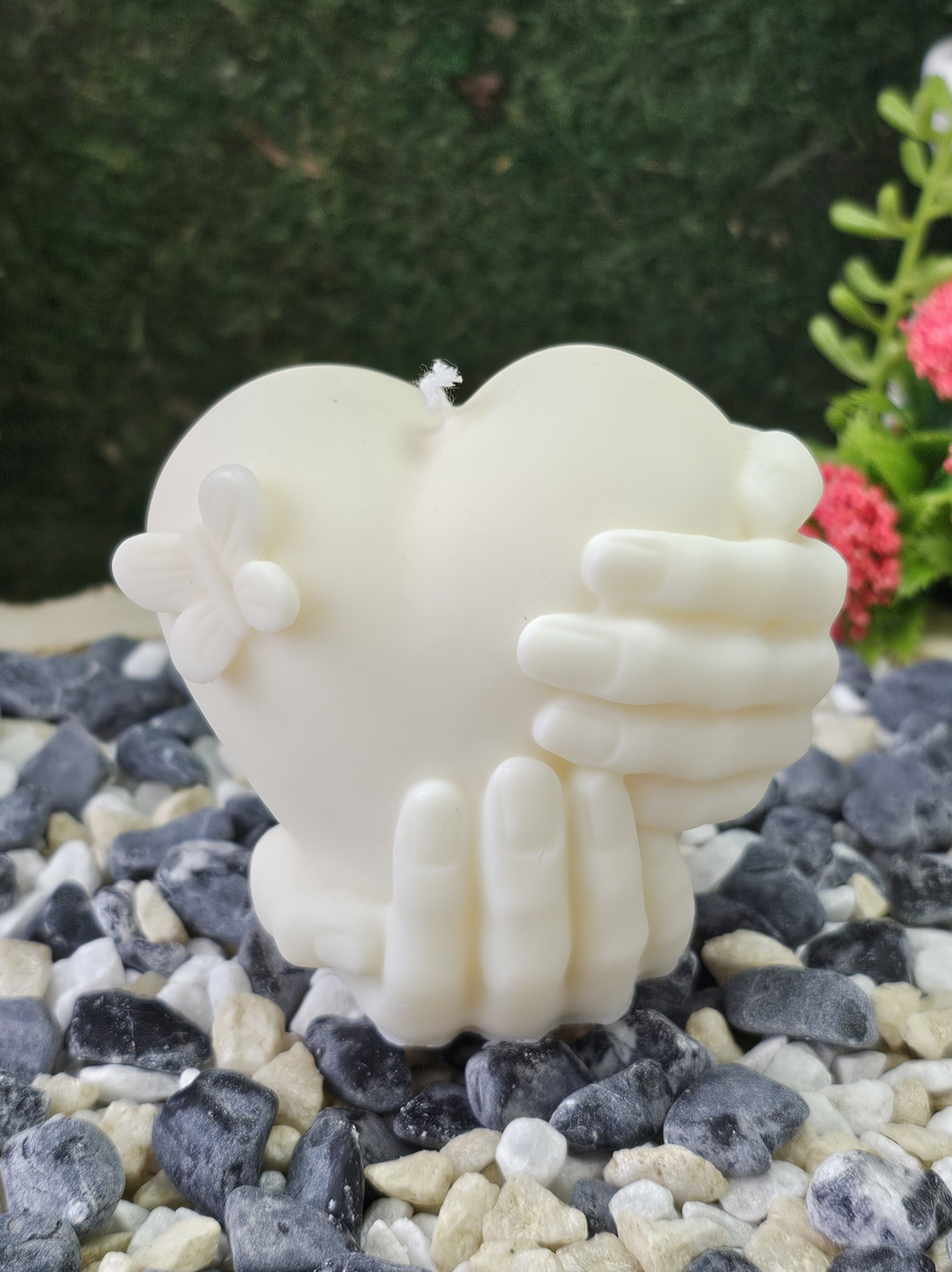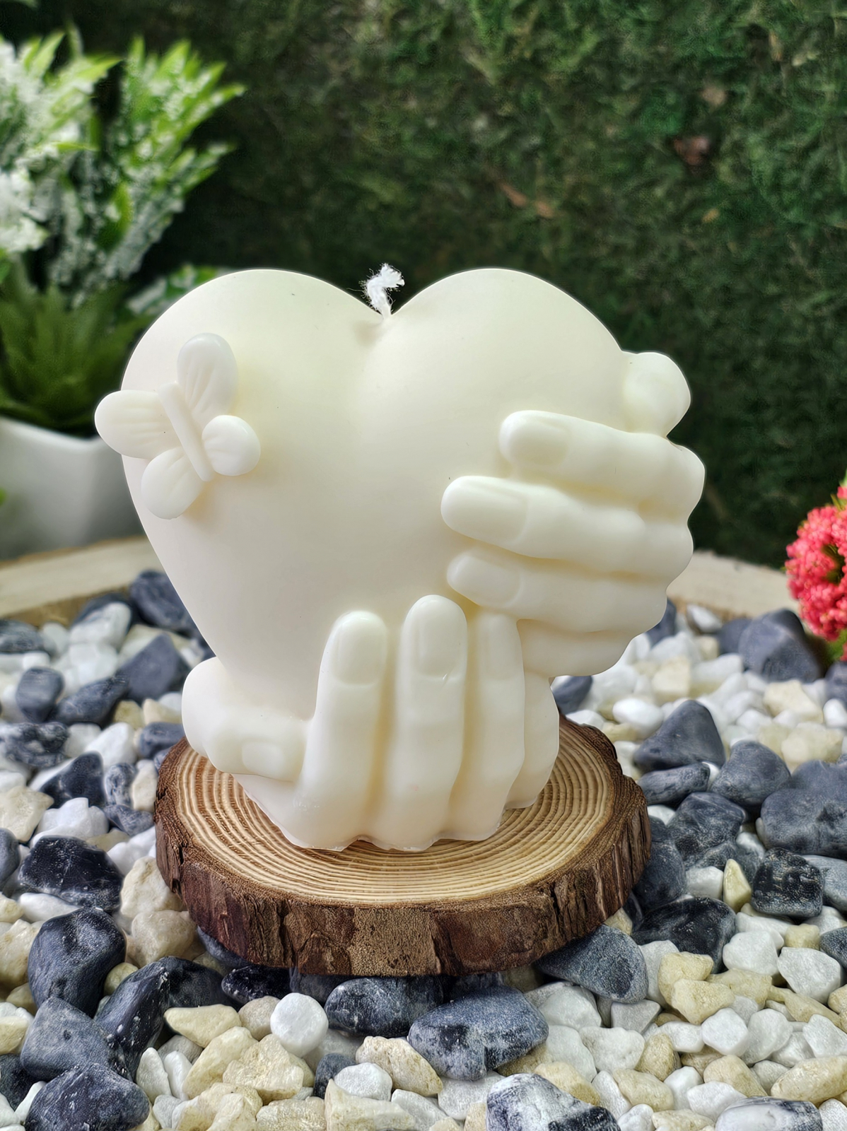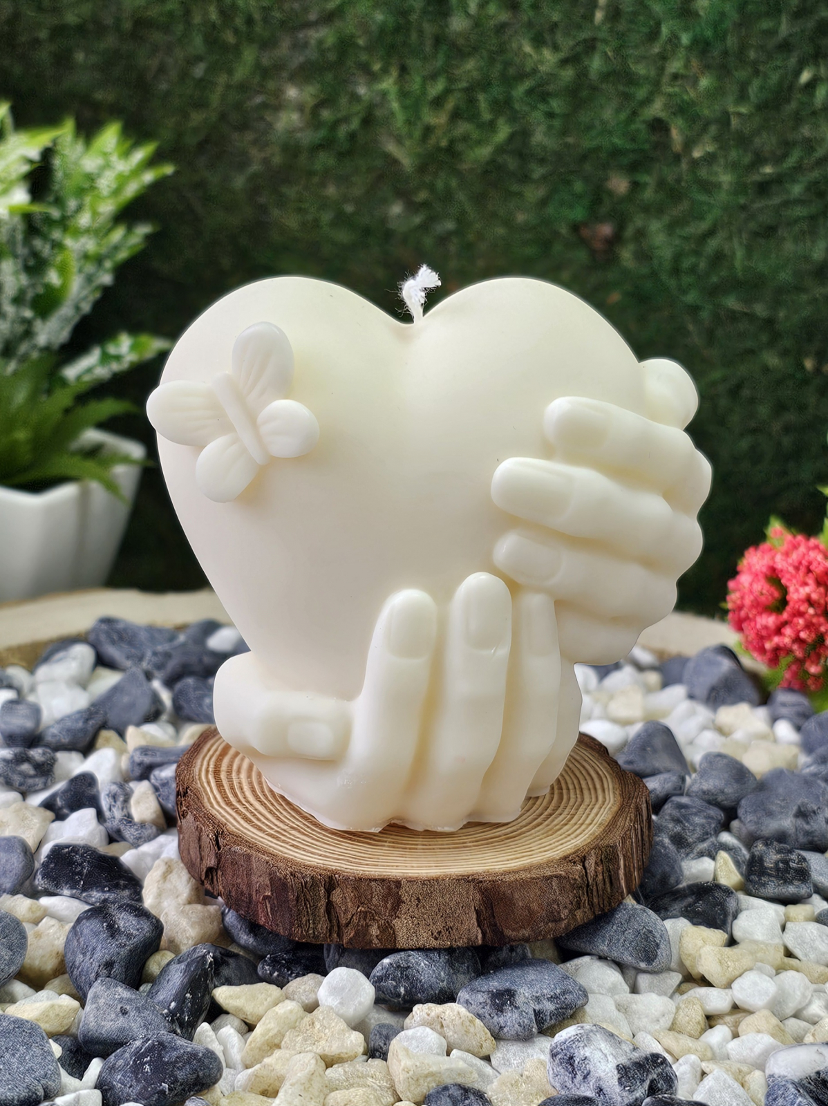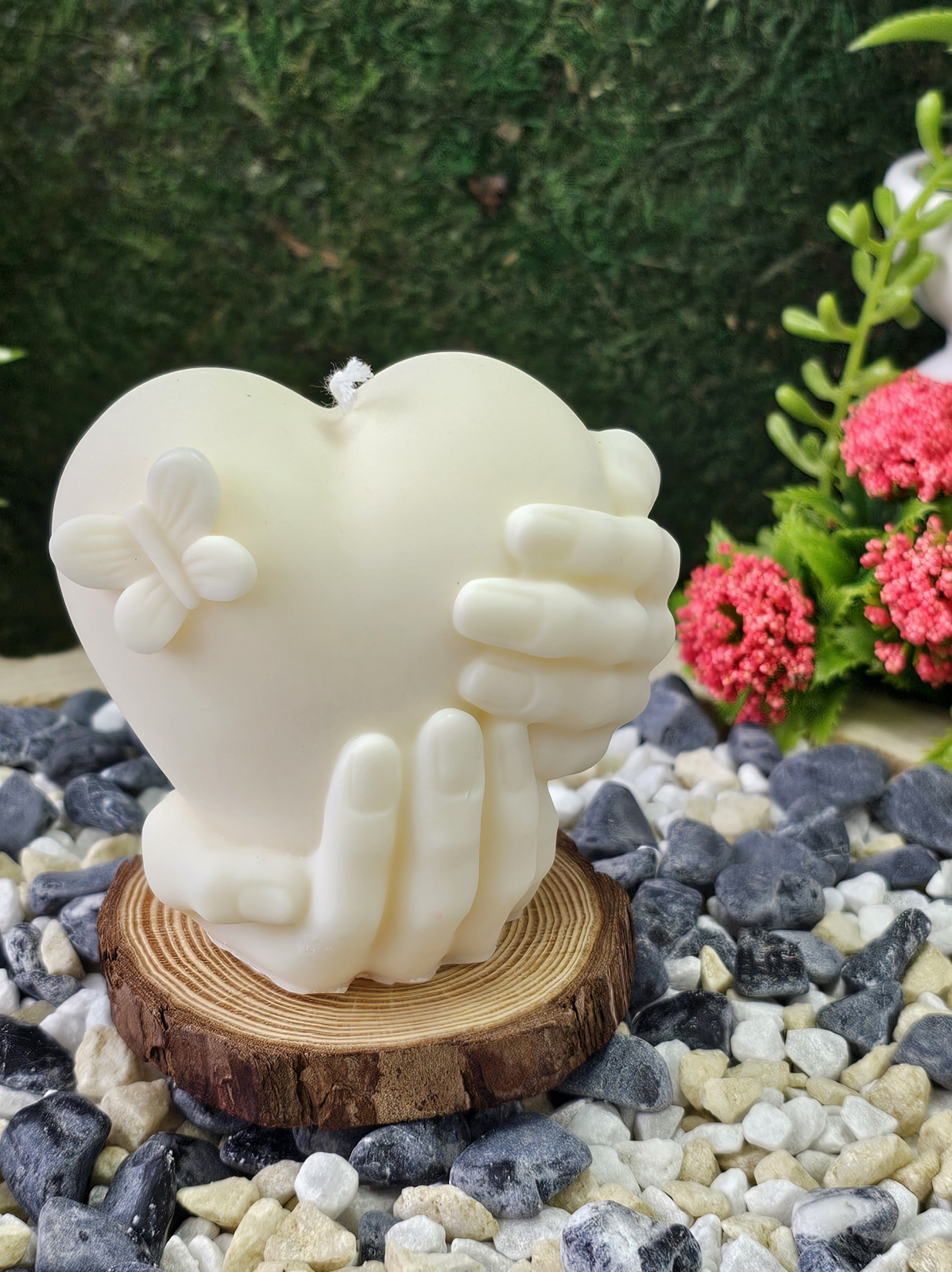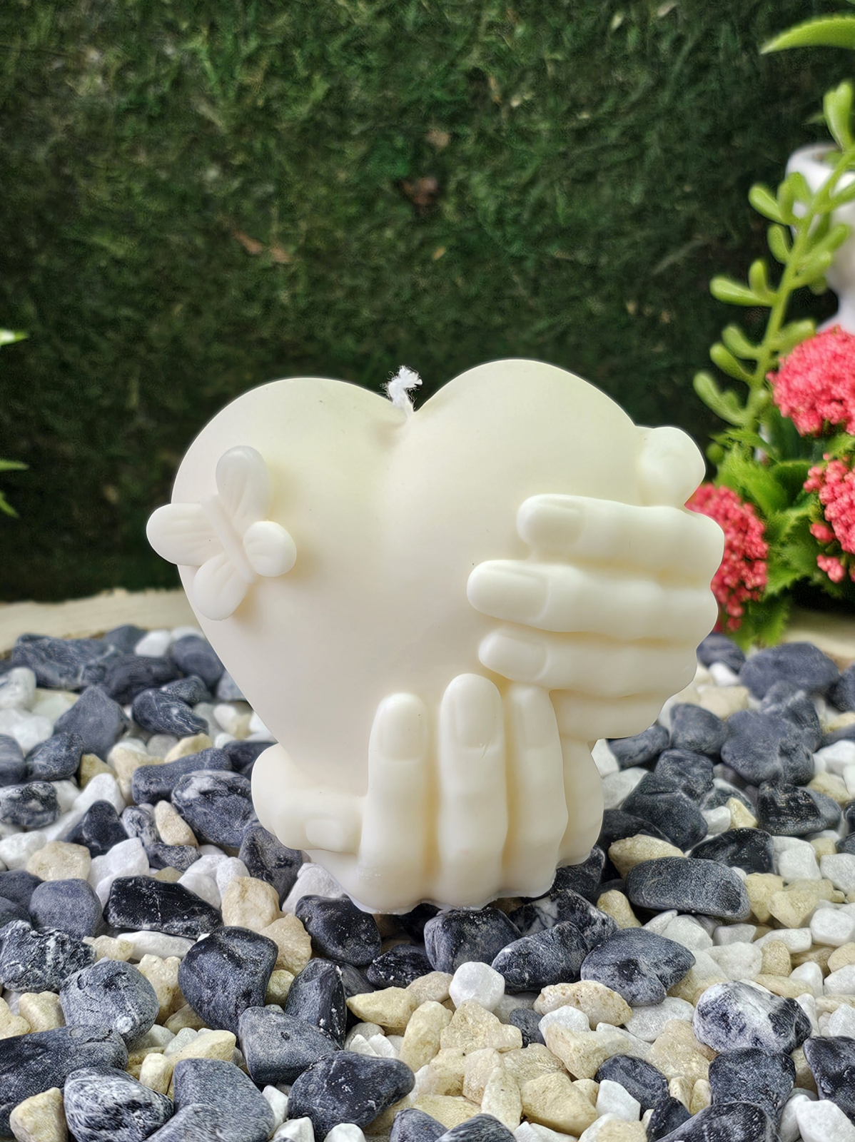 Realizată sub forma unei inimi purtate cu grijă de două mâini și împodobită cu un fluture grațios, această lumânare simbolizează iubirea protejată și transformarea unui nou început. Este o alegere unică și plină de emoție pentru mărturia voastră de nuntă.