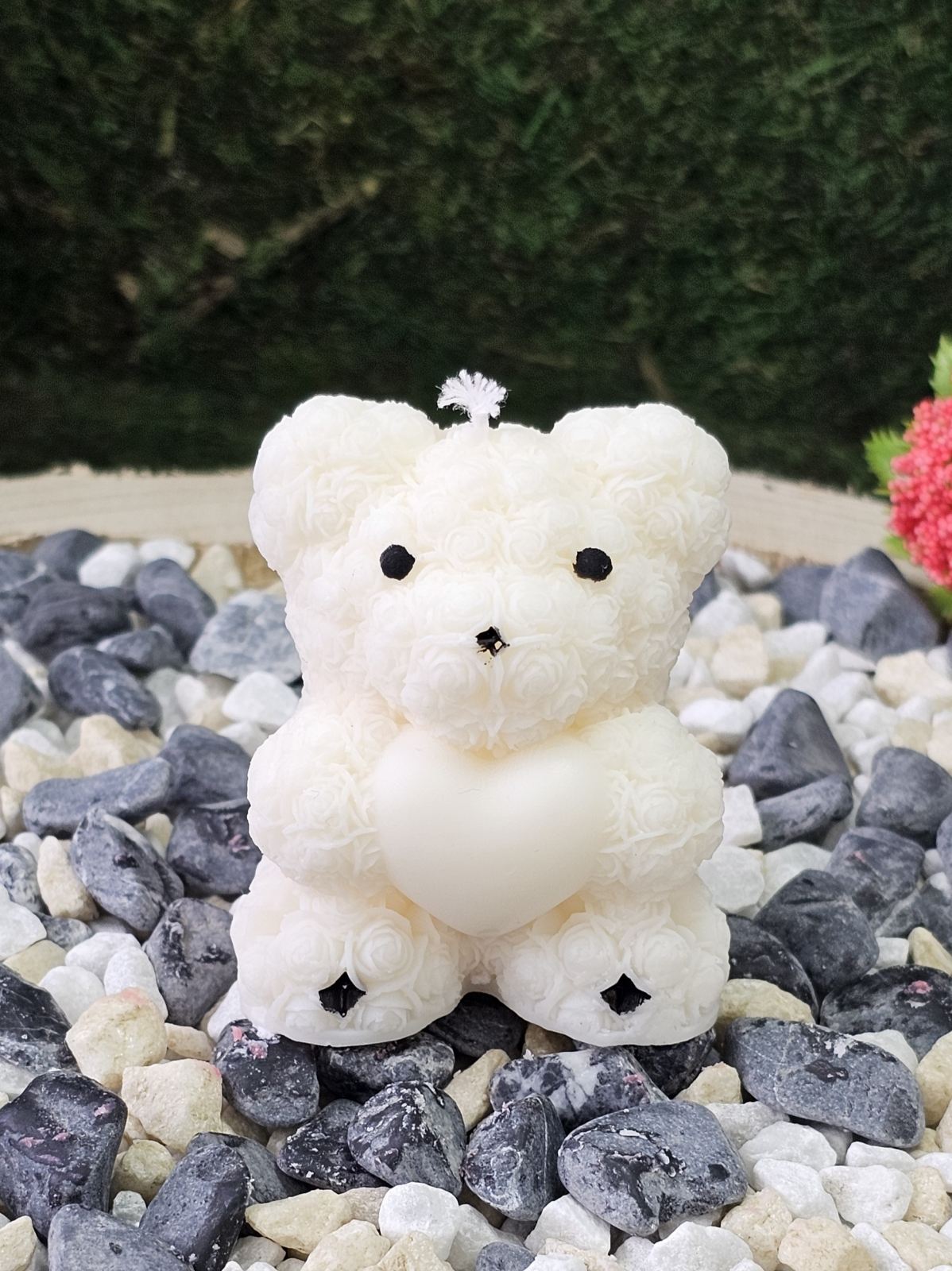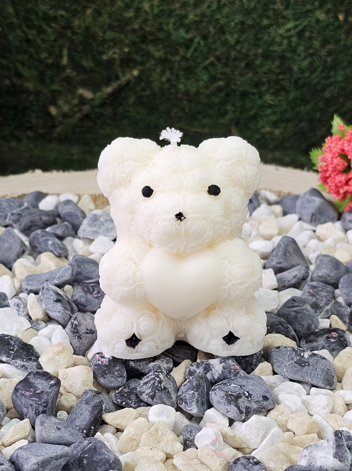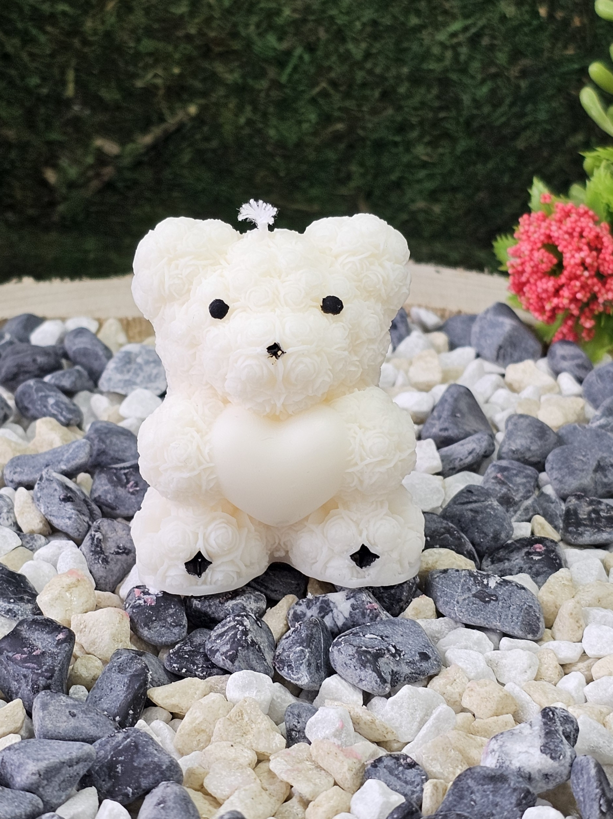 Cu trăsături delicate și o inimă strâns ținută în brațe, acest ursuleț alb din ceară decorativă este un simbol al grijii, inocenței și iubirii necondiționate. Trandafirii sculptați îi accentuează gingășia, iar patul de pietricele pe care este așezat adaugă o notă rafinată.