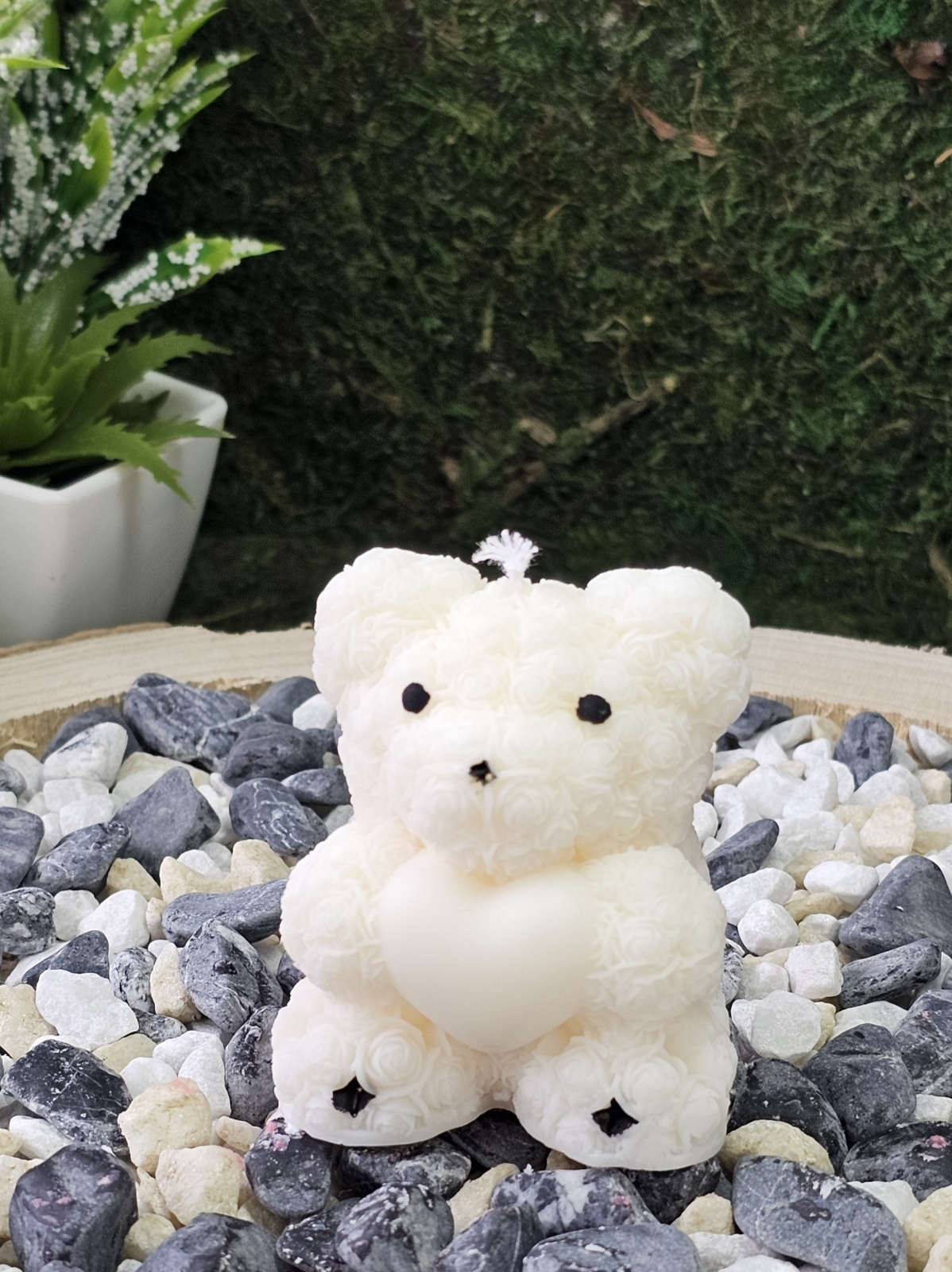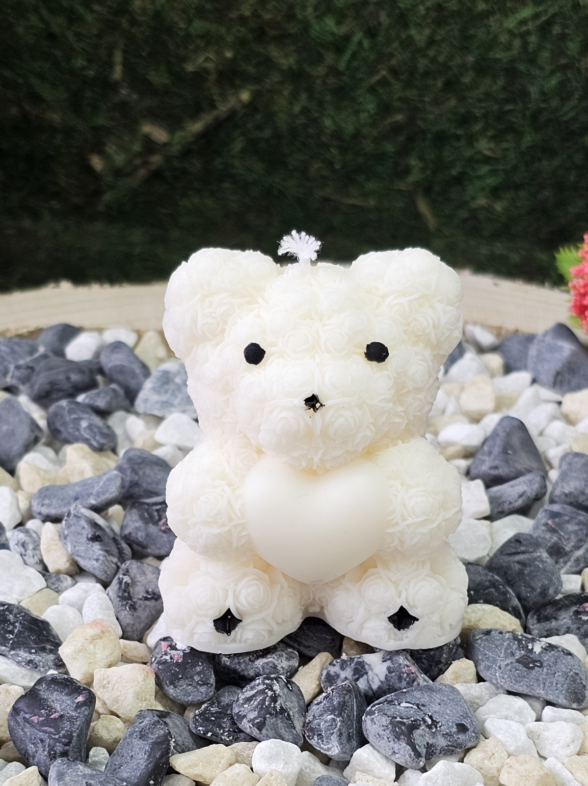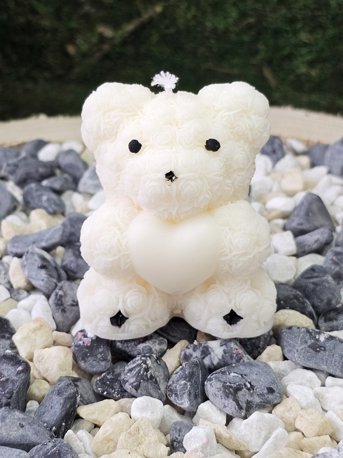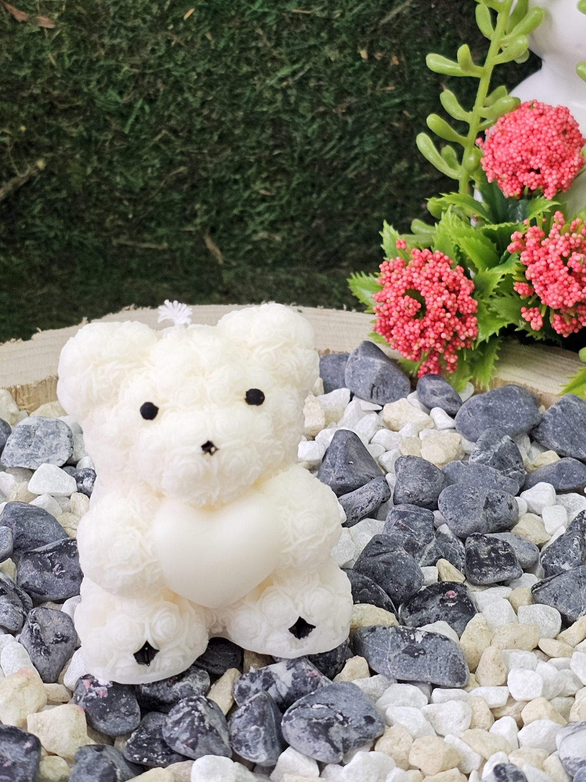 Cu trăsături delicate și o inimă strâns ținută în brațe, acest ursuleț alb din ceară decorativă este un simbol al grijii, inocenței și iubirii necondiționate. Trandafirii sculptați îi accentuează gingășia, iar patul de pietricele pe care este așezat adaugă o notă rafinată.