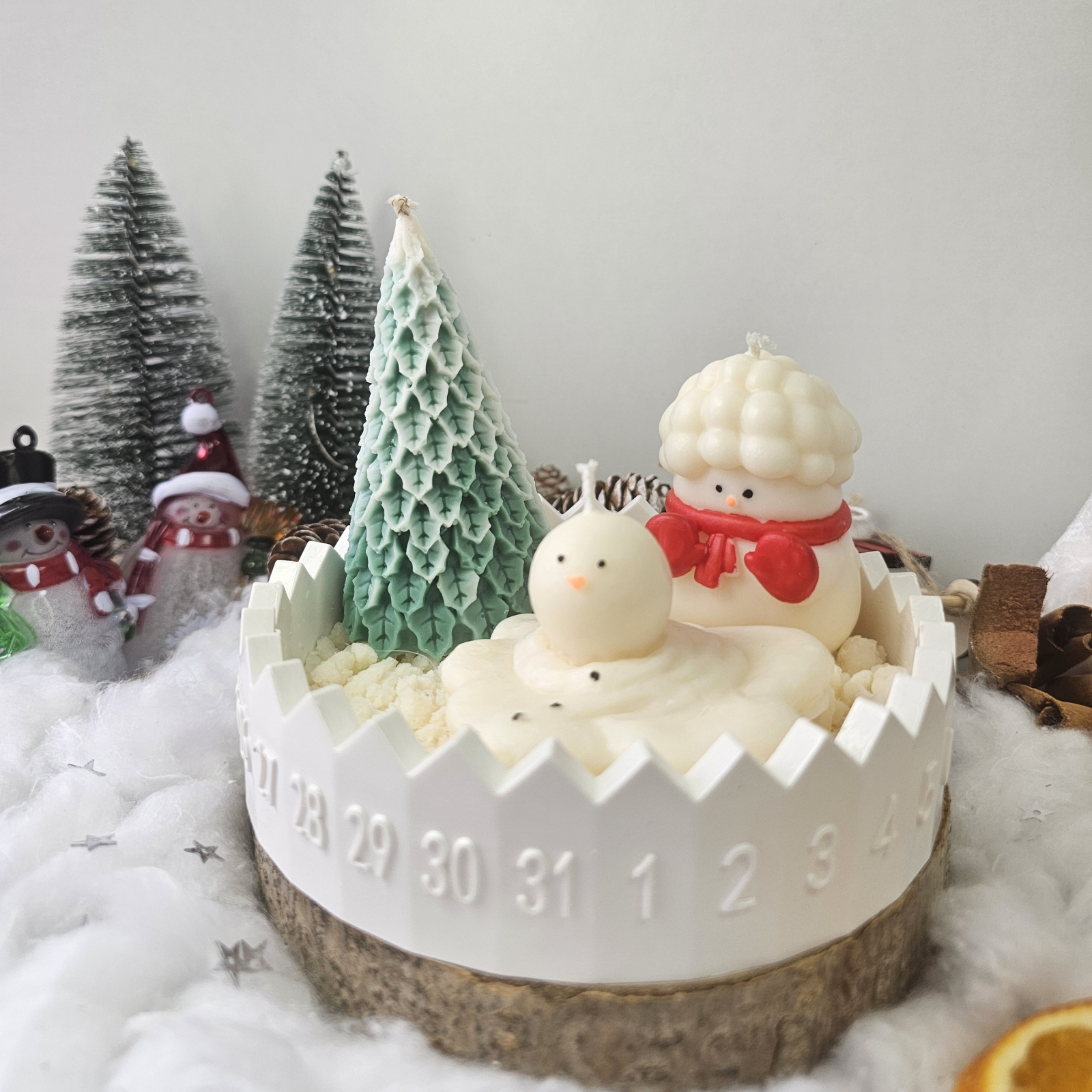 Toate sunt așezate pe un suport rotund din praf ceramic, cu margini zimțate și cifrele de la 1 la 31 embosate – un calendar simbolic care aduce magia fiecărei zile din decembrie. Baza este completată cu un „pat” de zăpadă din ceară de soia, ce oferă naturalețe și textură decorului.