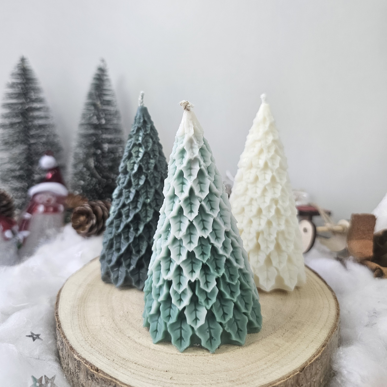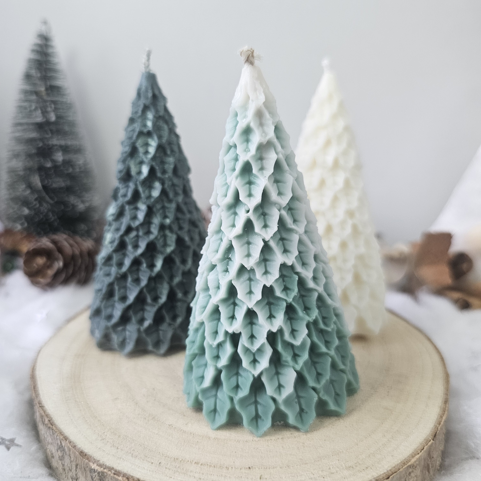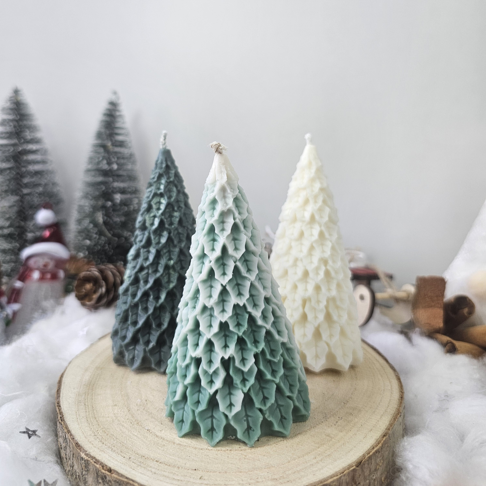 Set decorativ de Crăciun, realizat manual, compus din trei brăduți din ceară (55 g fiecare), în nuanțe complementare de alb, verde deschis și verde închis. Fiecare brad este modelat cu textură detaliată, ce amintește de frunzișul înghețat al pădurii, oferind un aspect natural și festiv.