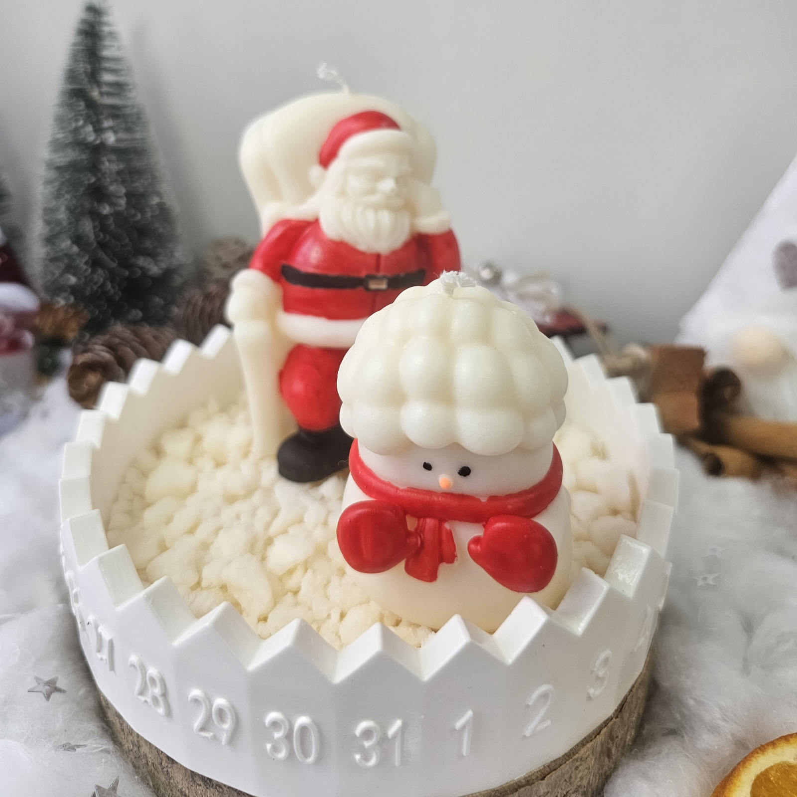 Set decorativ de Crăciun, alcătuit din două figurine pictate manual – Moș Crăciun (125 g) și un om de zăpadă vesel (60 g) – așezate pe un suport rotund creat din praf ceramic, modelat și finisat integral de mine. Baza este embosată cu cifrele de la 1 la 31, transformând decorul într-un calendar festiv unic.