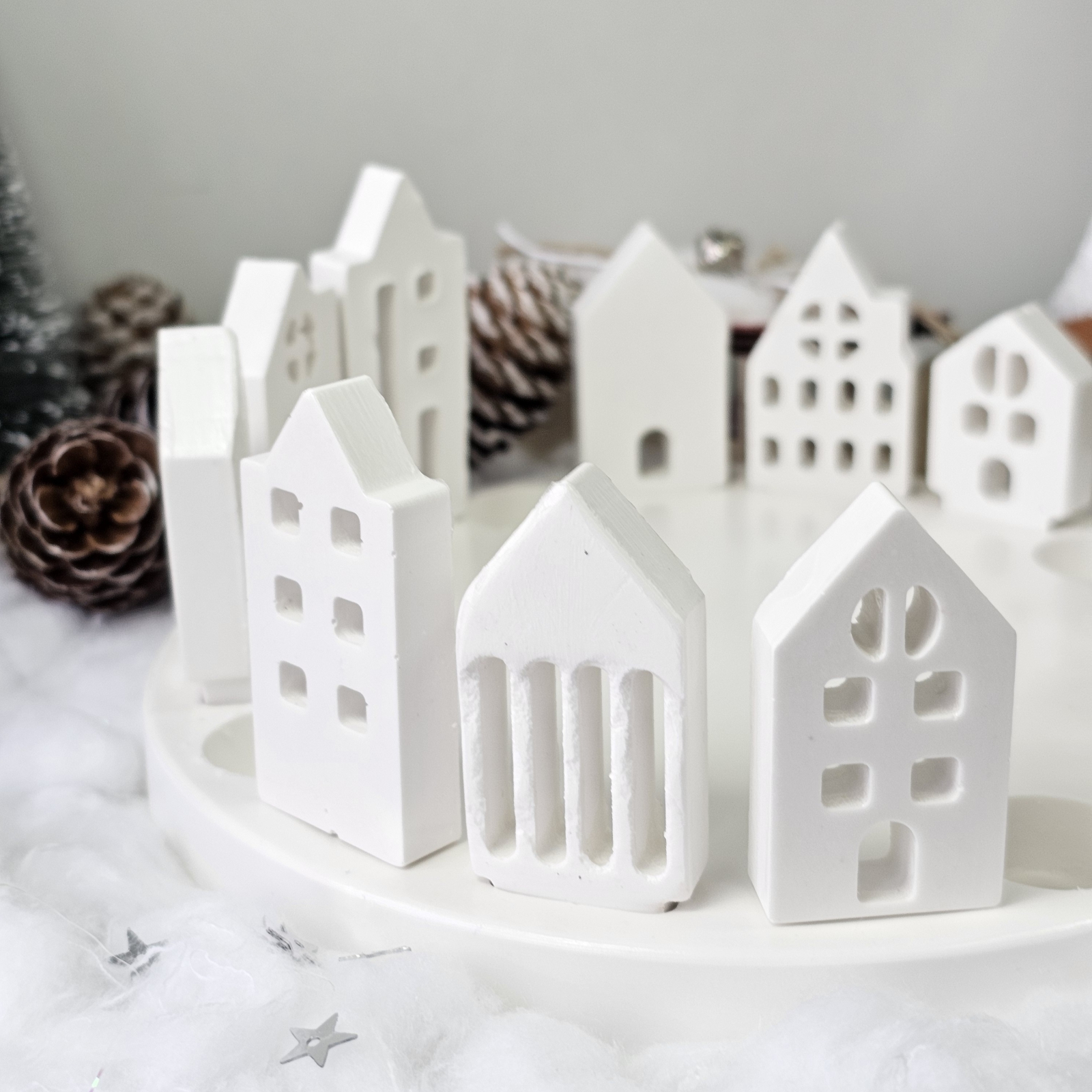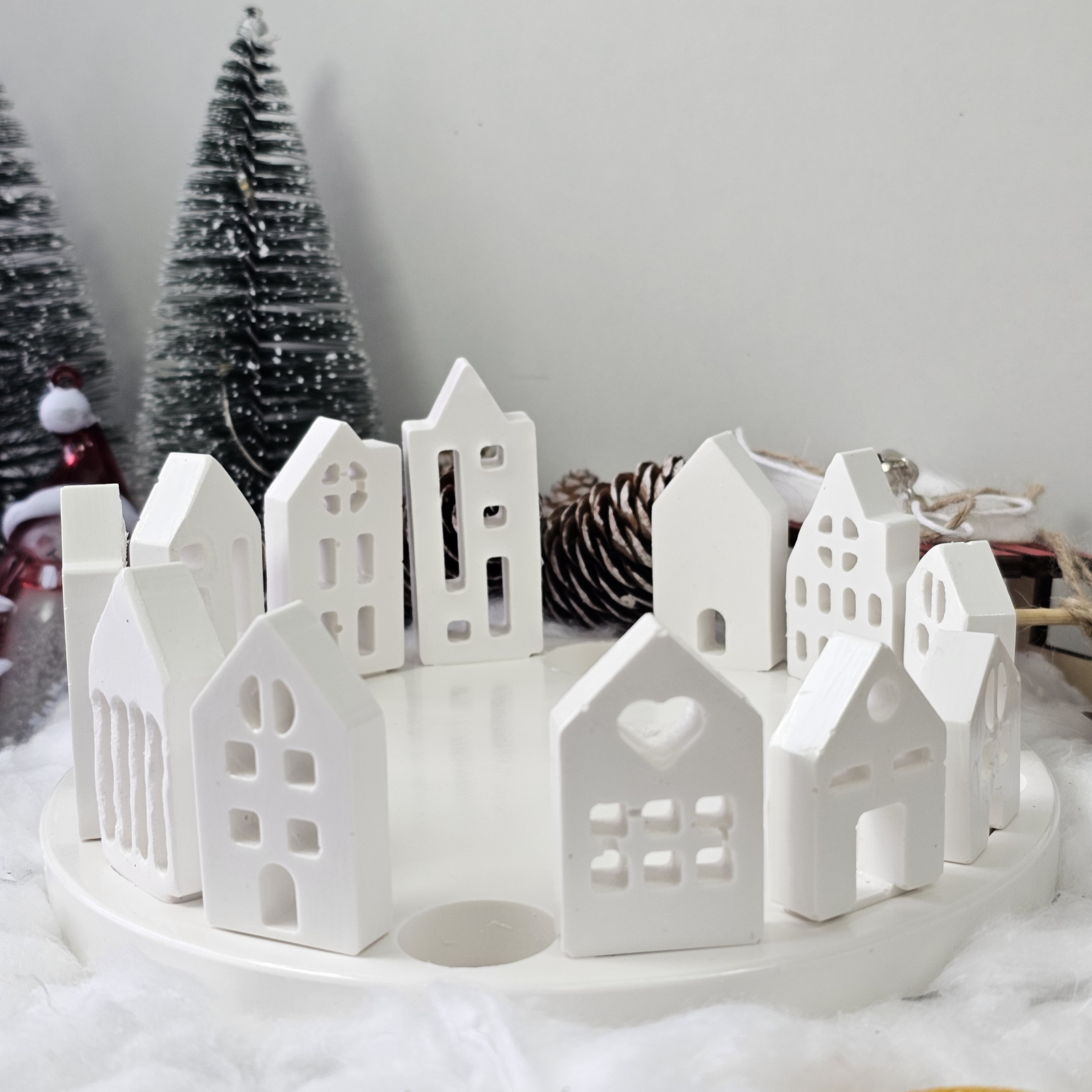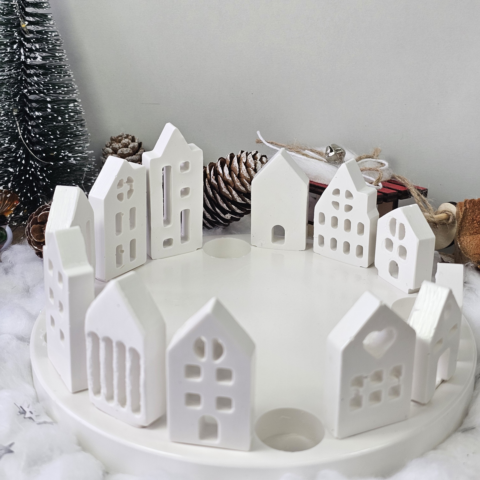 Cu căsuțe stilizate, ferestre decupate și detalii delicate, această sculptură circulară evocă liniștea unui peisaj acoperit de zăpadă, unde timpul pare să se fi oprit în ajunul Crăciunului.