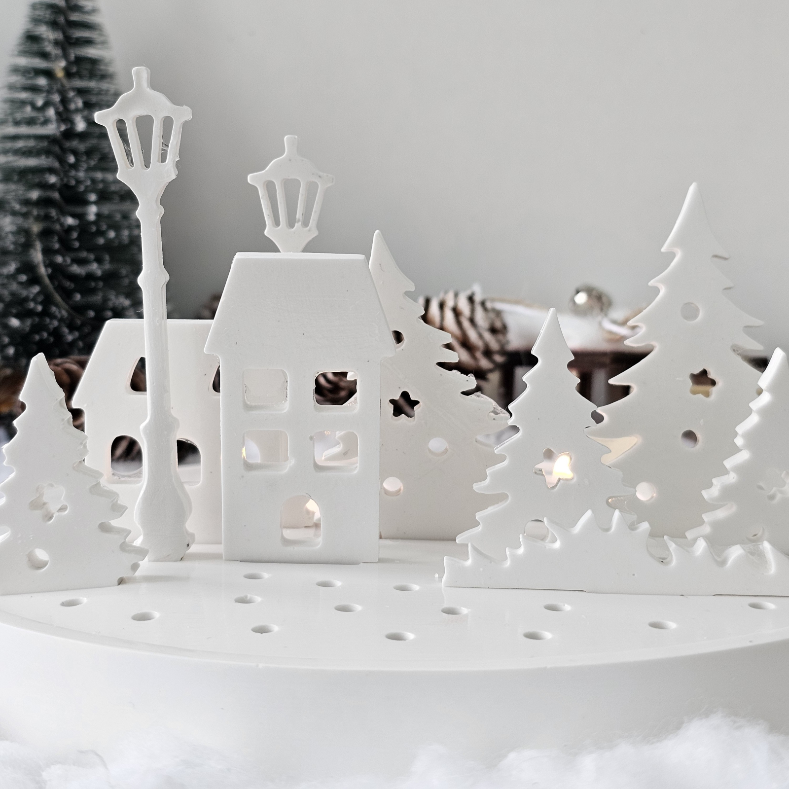 Realizat integral din ceramică albă, „Satul Alb” este un set decorativ care surprinde liniștea și farmecul unui peisaj de iarnă. Cu siluete decupate de brazi, căsuțe și suporturi pentru lumânări, fiecare piesă este lucrată cu atenție la detalii, având o finisare mată și elegantă.